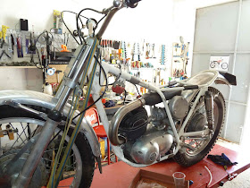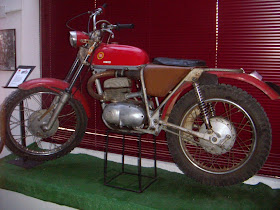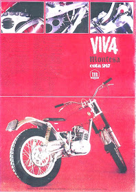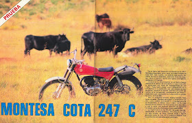 También tengo detalles de esta moto esculpidos en algún lugar. Iba yo con mi BH gacela, roscando el puño derecho como si diese gas, por las calles del diminuto pueblo de la provincia de Ávila dónde iba los fines de semana con mis padres y hermanos. Allí estaba, como una aparición divina al doblar la esquina de una calle del pueblo, apoyada en una pared de piedra de granito. Podría decir exactamente dónde hoy día y hará más de 30 años. ¡Es una de trial! ¡Cota encima! Y gorda. Una 247, pero ... no tiene el depósito liso. Me quedé de nuevo inmóvil ante tal monumento. Escrutaba hasta el más mínimo detalle, hasta que llegué a la tapa del cárter izquierdo. ¡Qué pasada! Como en las Cappra, igual que en la 348 pero mucho más bonita en aluminio pulido y con letras e interior de escudo en negro. Se me pasó el horror que me producía el nuevo asiento ahora más mullido abandonando el finito anterior. El cable y palanca de embrague por arriba, ¡como debe ser! pensé.