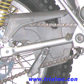 En cuanto a la versión en sí es la conocida “tambores grandes” por su obvios bujes de ruedas ó MK I por ser la primera versión. Cuando aparece esta moto no sé si los tambores resultaron normales, medianos o grandes, pero hoy día para los iniciados en esto del trial, y concretamente al clásico, los tambores son descomunales. La corona trasera en acero está taladrada muy en la periferia debido precisamente al tamaño del tambor trasero, que de otra manera taparía los agujeros. Las llantas anchas y con nervios las hacen también muy particulares en este modelo.